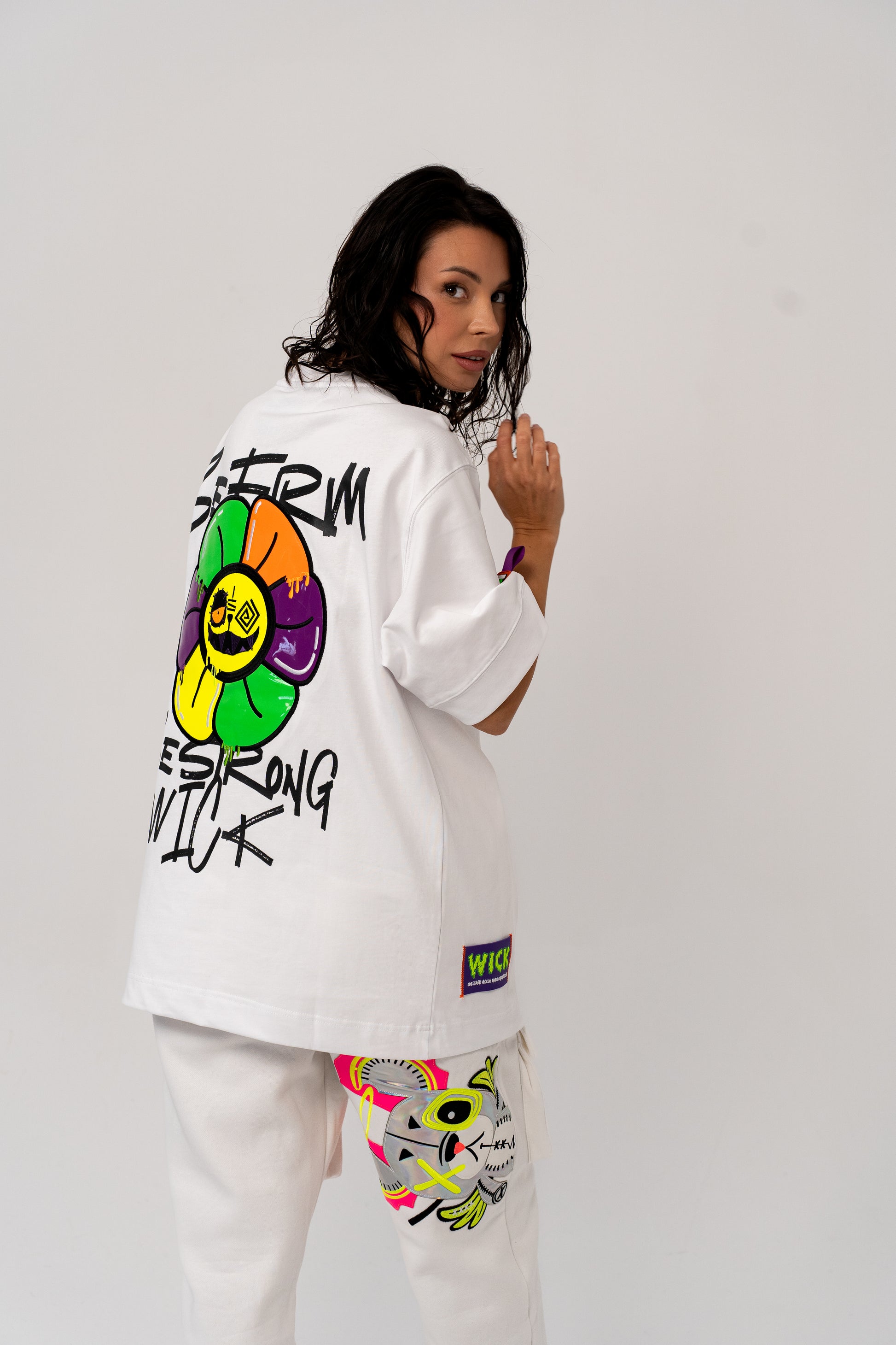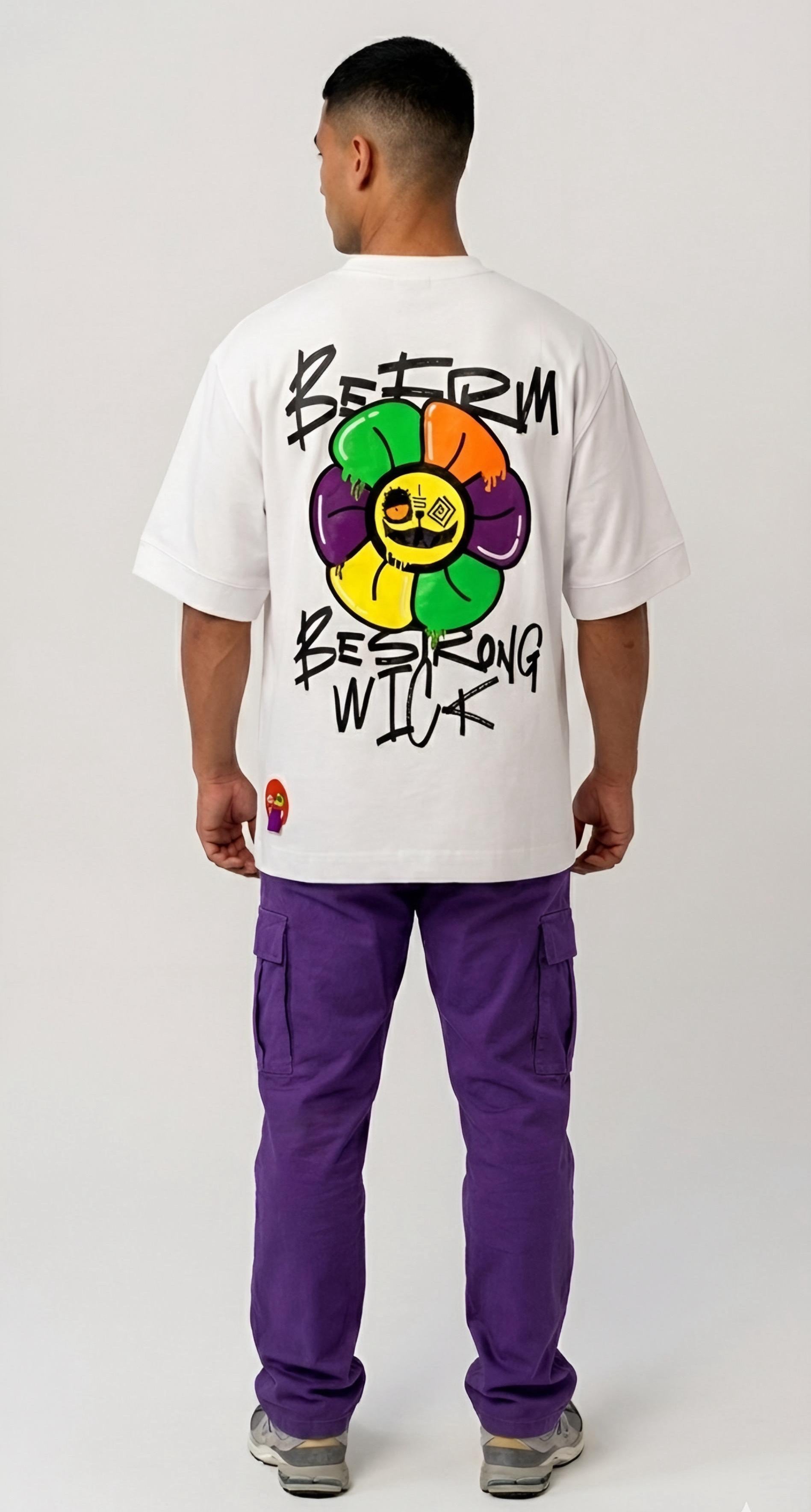 Color, chaos, and attitude — this tee brings it all. The Neon Ice Flower T-Shirt features a bold multicolor monster-flower graphic symbolizing strength through creativity. “Be Firm. Be Strong. WICK.” hits the back in graffiti lettering, turning streetwear into a statement.